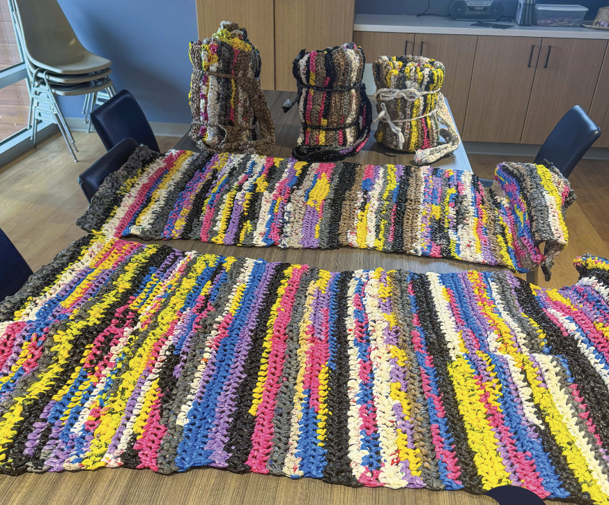 Earlier this year, staff from Mount View Care Center, North Central Health Care’s Skilled Nursing Facility, put out a call for donated plastic shopping bags from employees and community members. The response was overwhelming, with more than 3,500 bags collected. Over the following months, residents and staff worked together to repurpose the bags into “plarn,” or plastic yarn, which was then crocheted into five durable sleeping mats for individuals experiencing homelessness in the Wausau area.