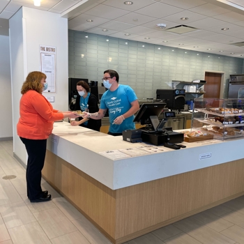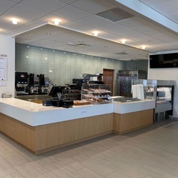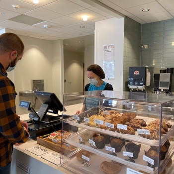The Bistro is open morning through early afternoon serving coffees, teas and specialty paninis, wraps, salads and sandwiches. Enjoy an early morning breakfast on the go, or have a seat by the fireplace and relax with a latte.