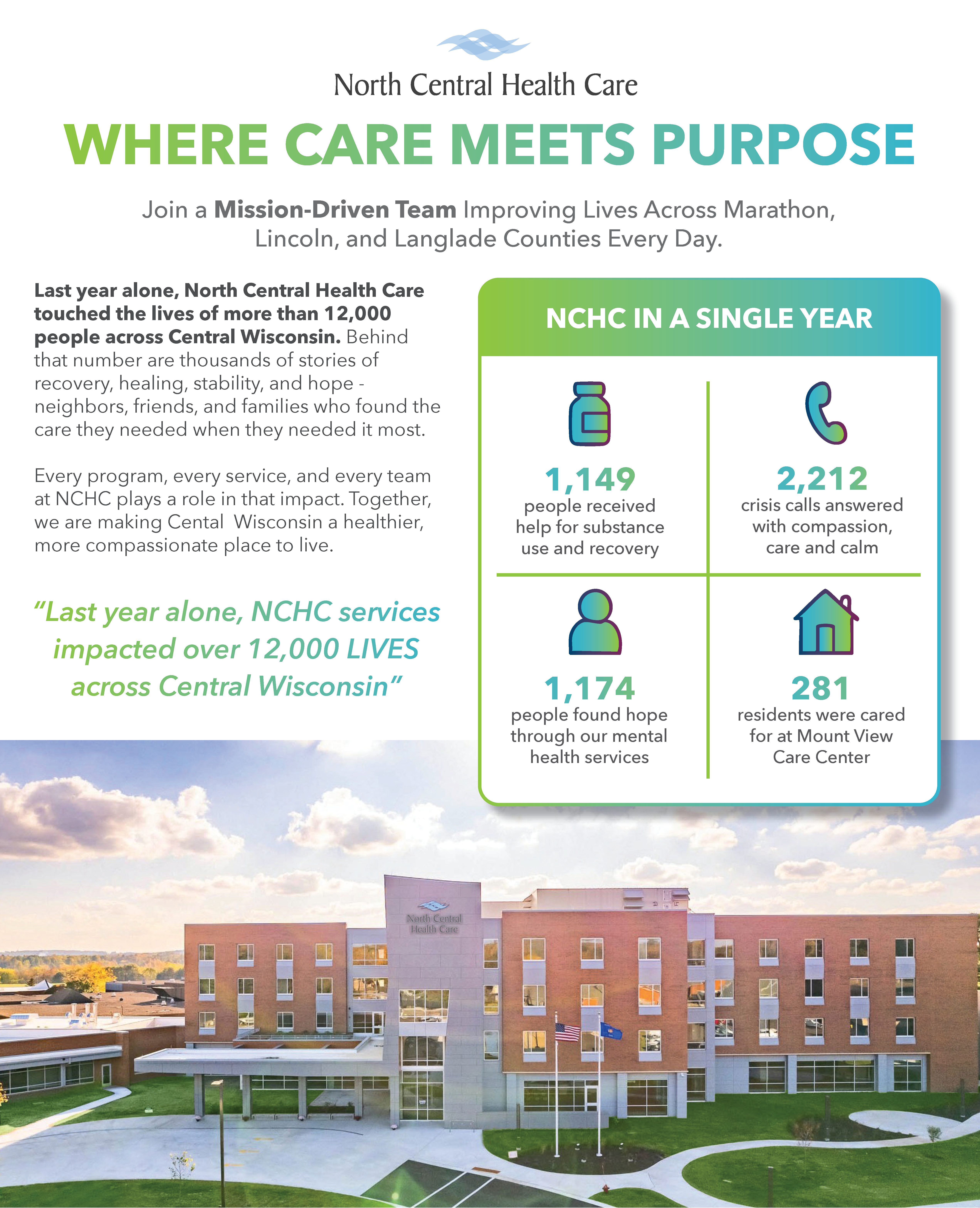 Last year alone, North Central Health Care touched the lives of more than 12,000 people across Central Wisconsin. Behind that number are thousands of stories of recovery, healing, stability, and hope neighbors, friends, and families who found the care they needed when they needed it most. Every program, every service, and every team at NCHC plays a role in that impact. Together, we are making Central Wisconsin a healthier, more compassionate place to live.